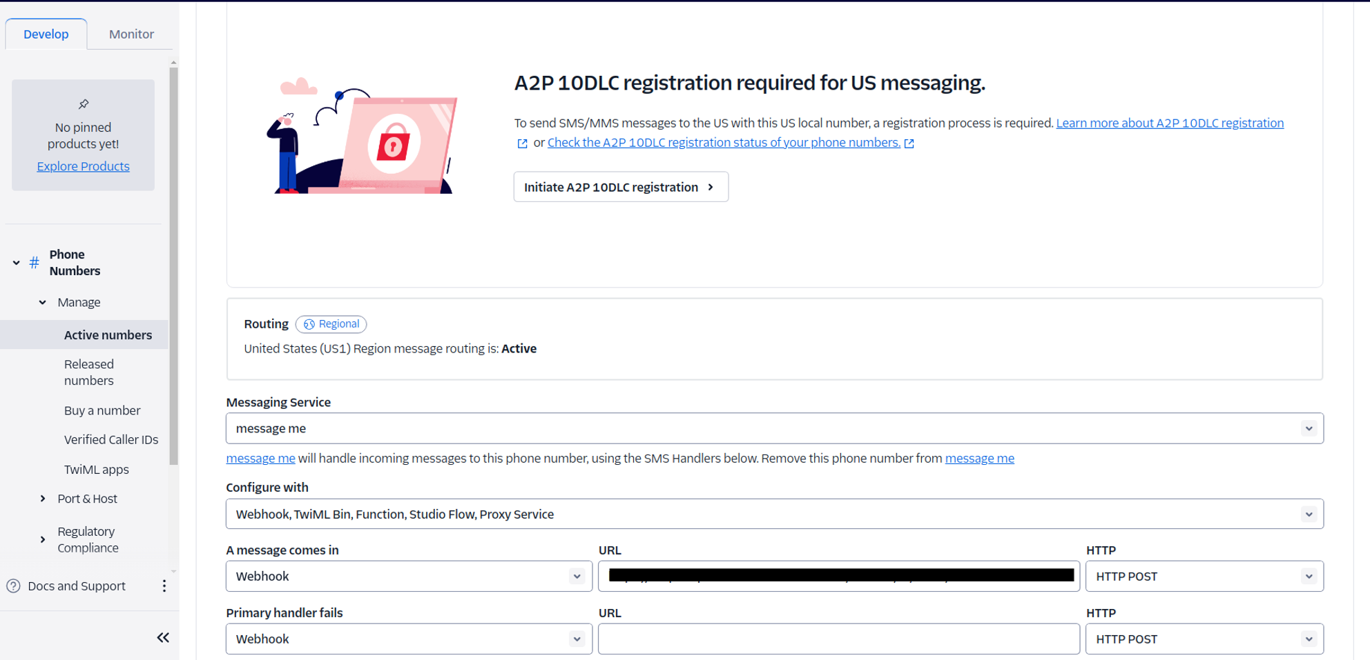 - Go to Develop → View All Numbers → Select your number → Configure.