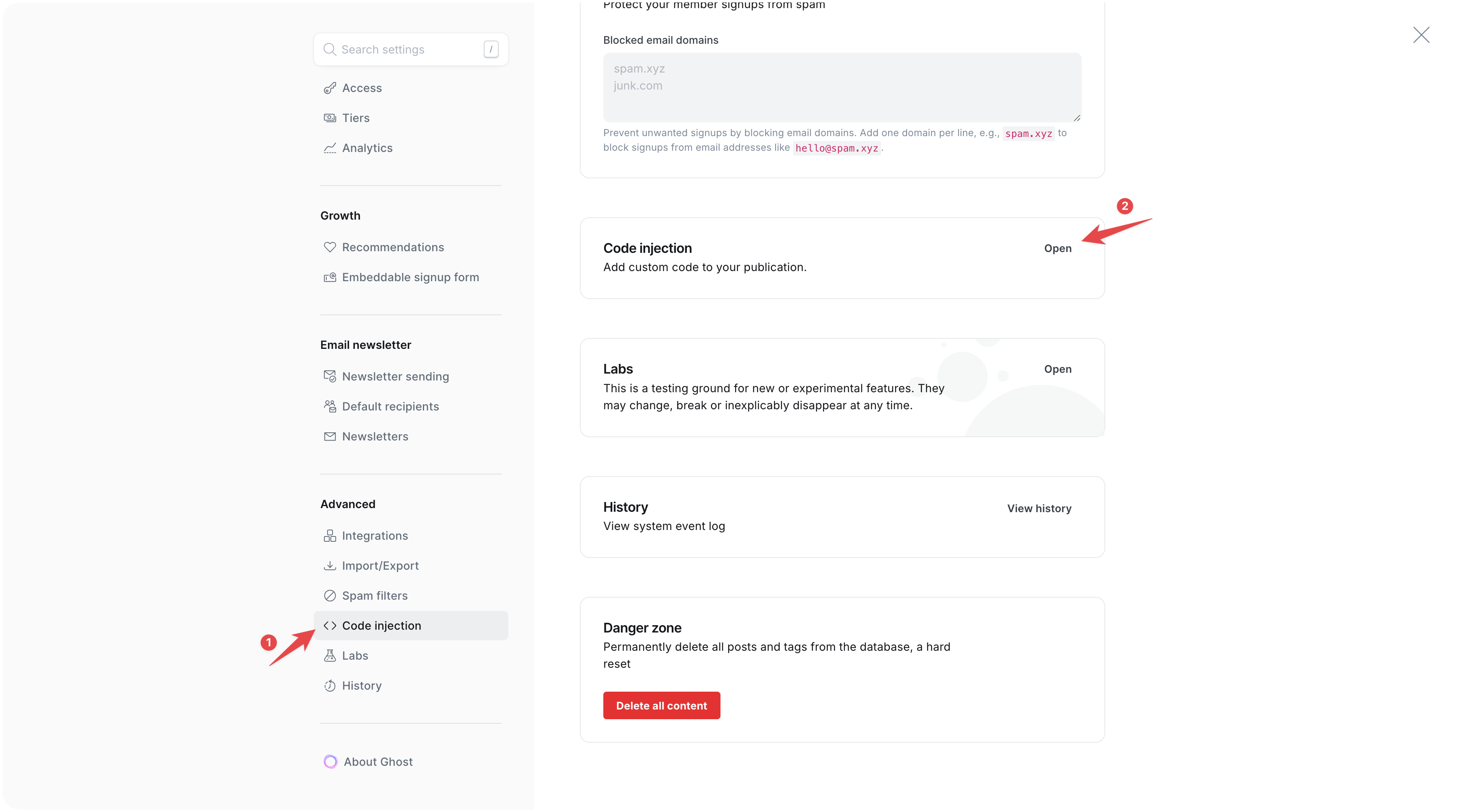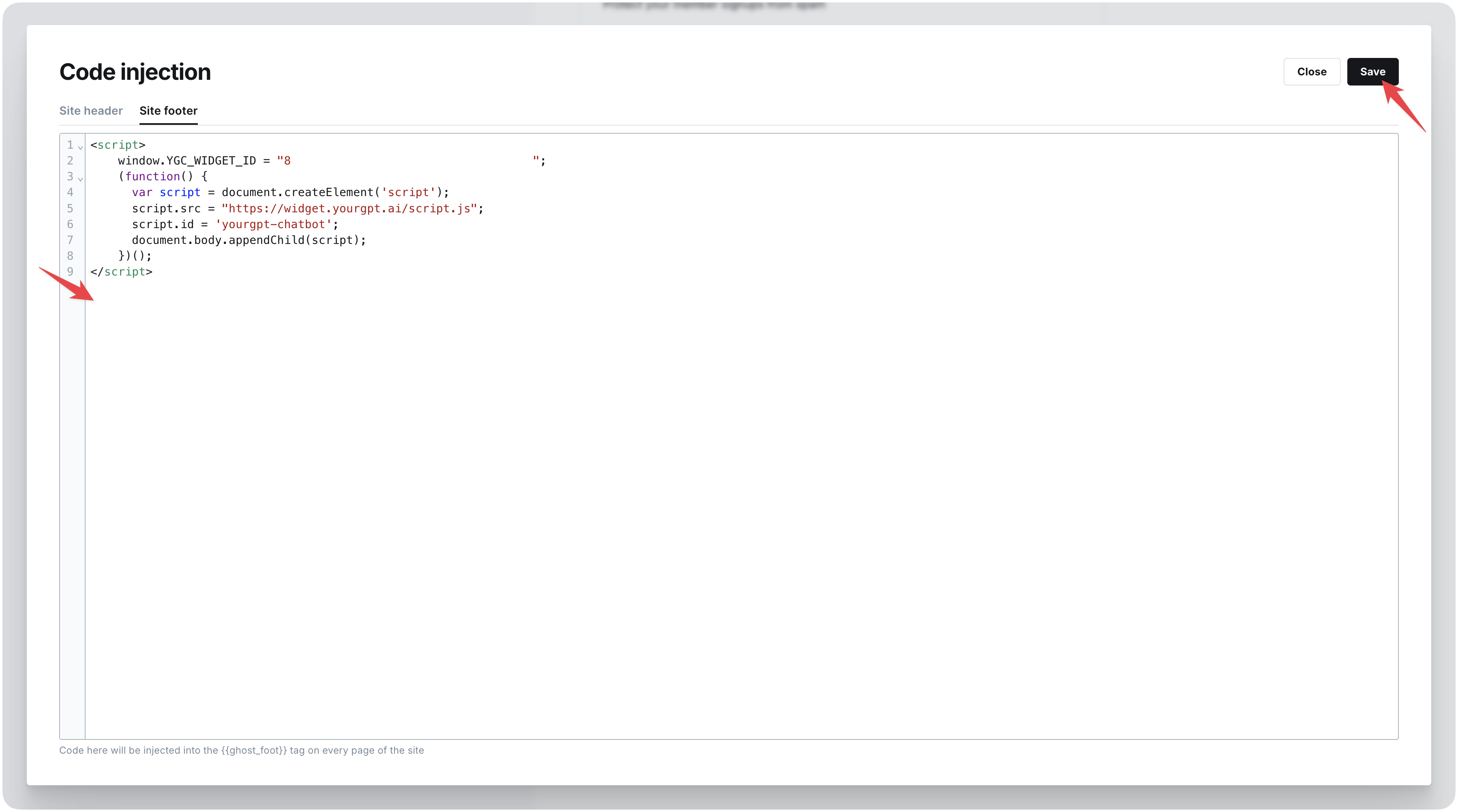 Ghost's "Code Injection" feature makes it easy to add your YourGPT AI Agent to your website. This seamless integration works similarly to adding Google Analytics or other JavaScript code to your site.