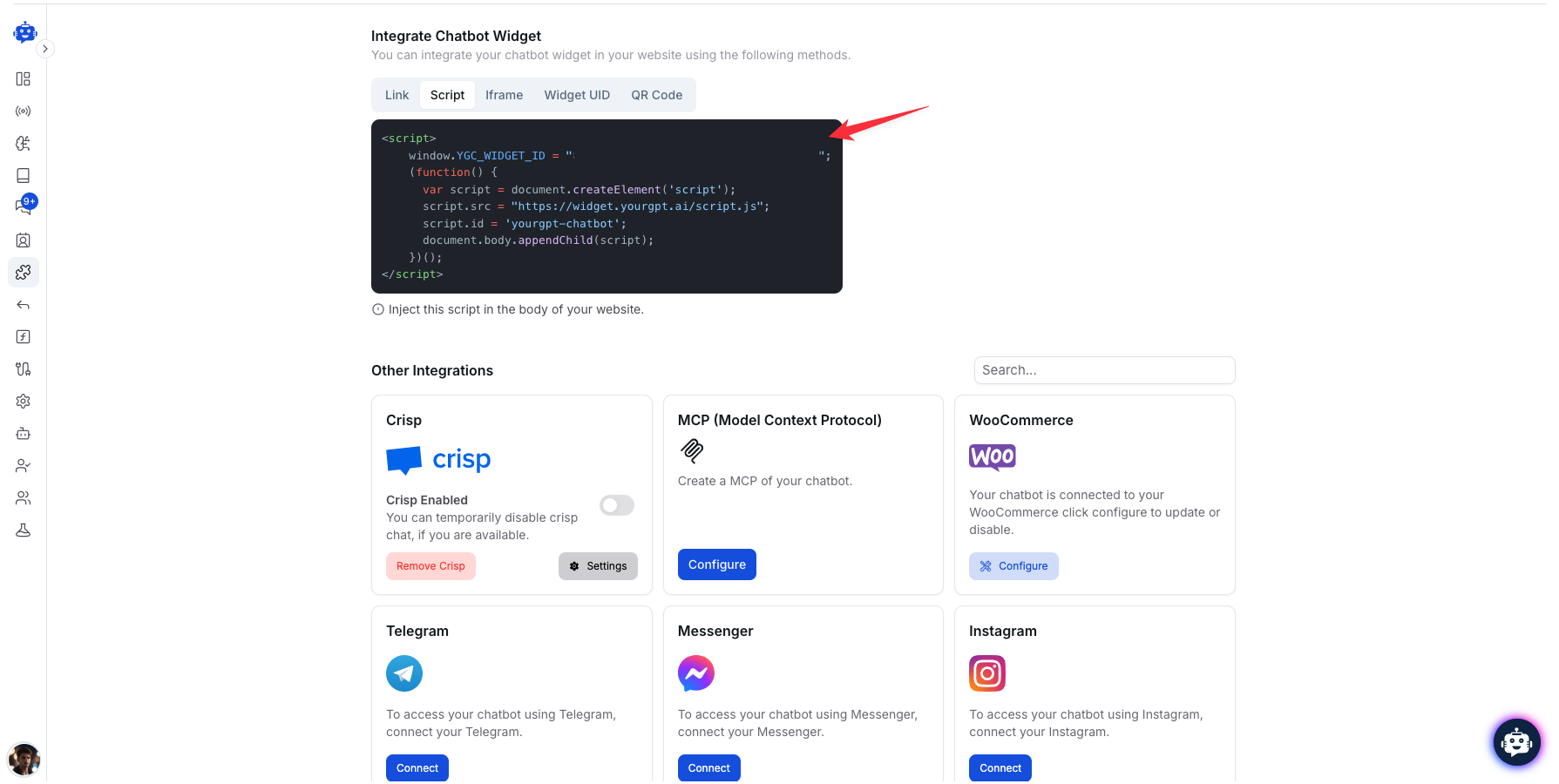 - Find your AI Agent's widget script (it will look similar to the example below)